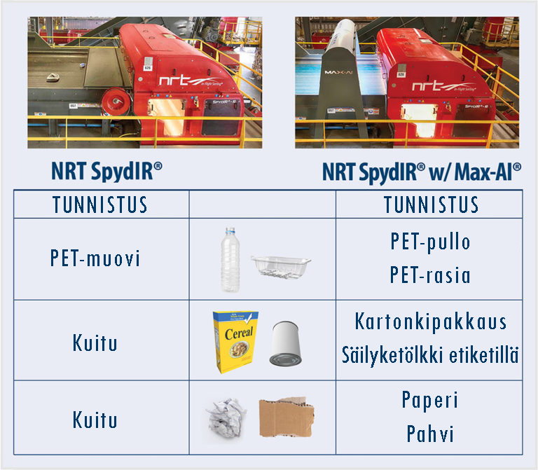 Bulk Handling Systems yritysryhmään kuuluva NRT on ratkaissut optisen lajittelun puutteita lisäämällä robottilajittelija MAX-AI:n konenäön optisiin lajittelijoihin. Näin ollen optisella lajittelijalla on lajittelupäätöksen tekemiseen enemmän tietoa ja se lisää merkittävästi jakeiden puhtausasteita. Tällä on suuri vaikutus lajitelluista jakeista saatuihin tuottoihin.